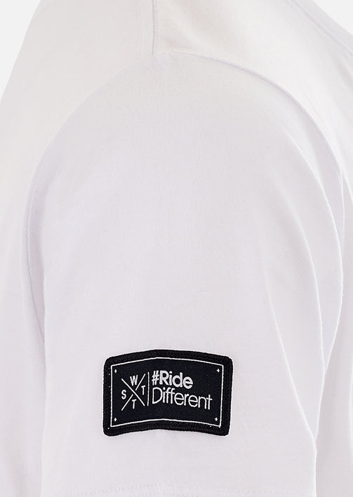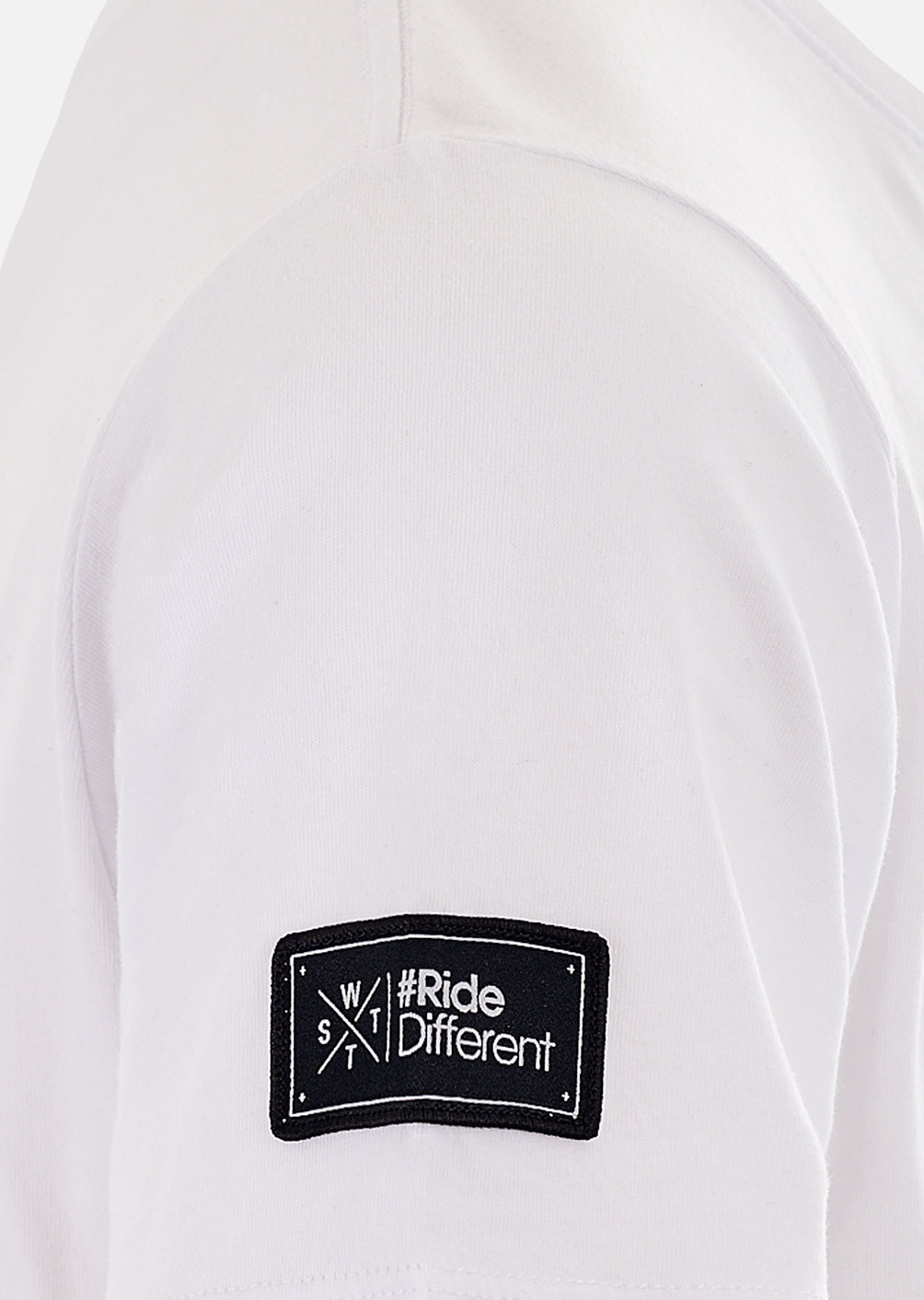 - Patch tissé appliqué et centré sur le bas de la manche droite