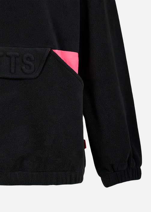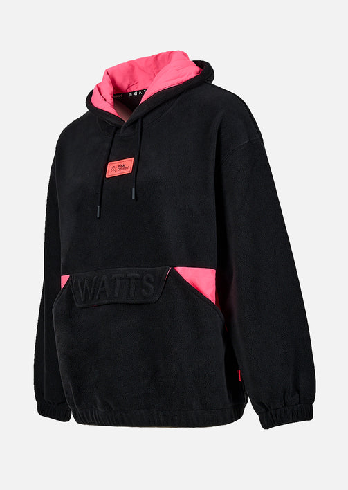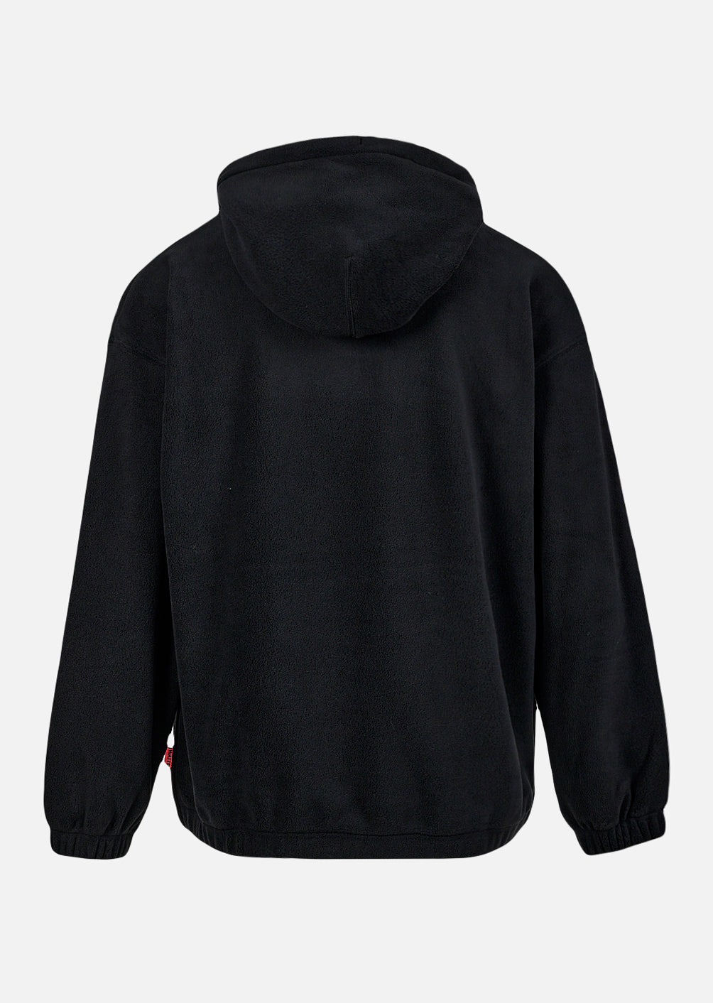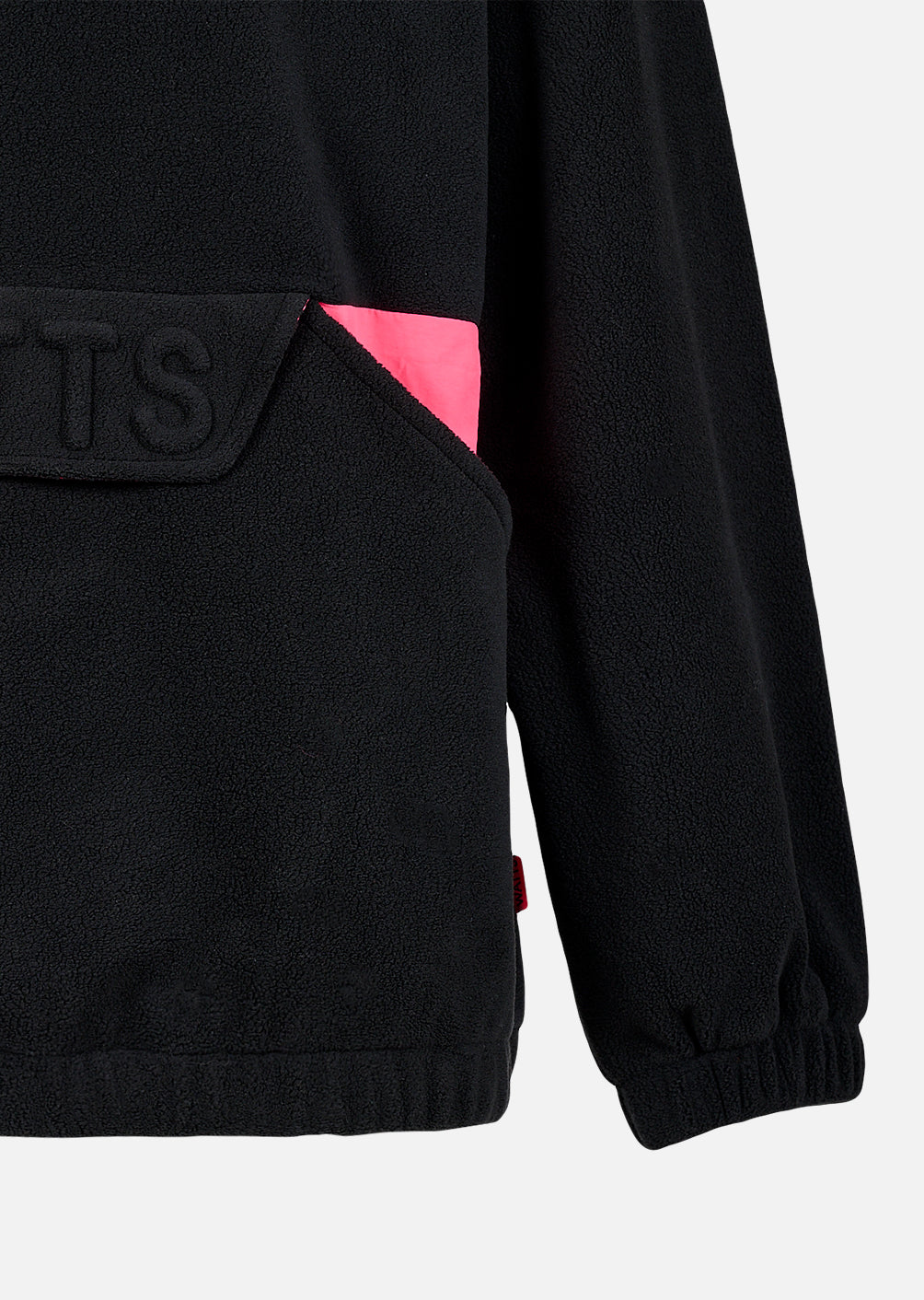 Fabriqué en polaire légère issue de fibres recyclées, il procure une chaleur douce tout en garantissant une grande respirabilité. Sa capuche enveloppante, son col montant fermé par patte tissée et sa grande poche kangourou à rabat soulignent sa dimension fonctionnelle.