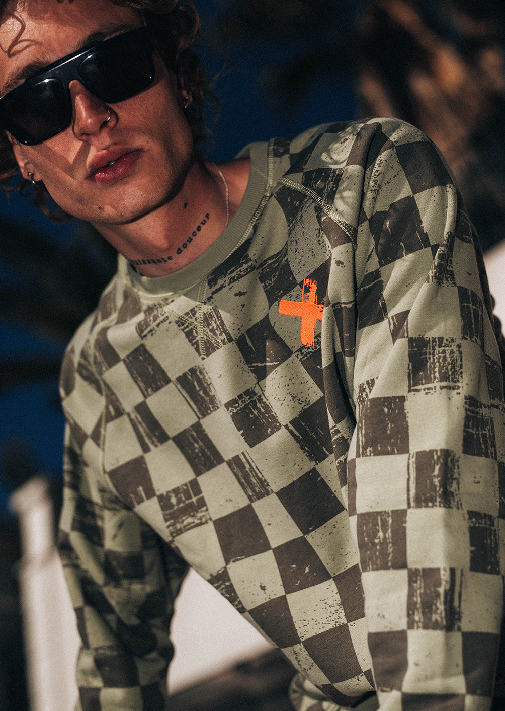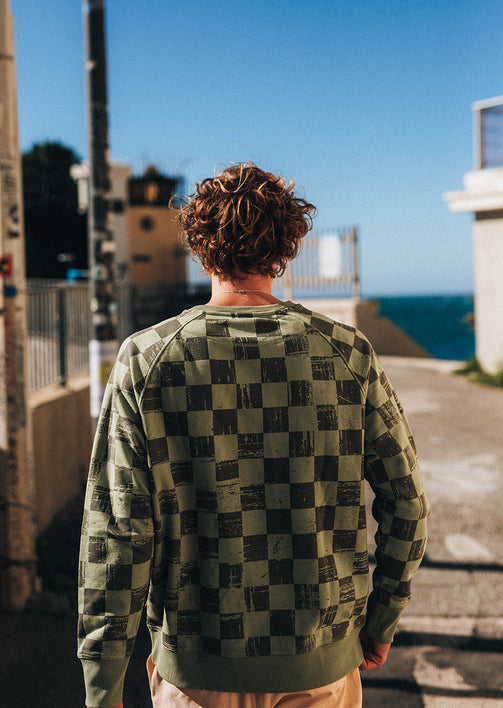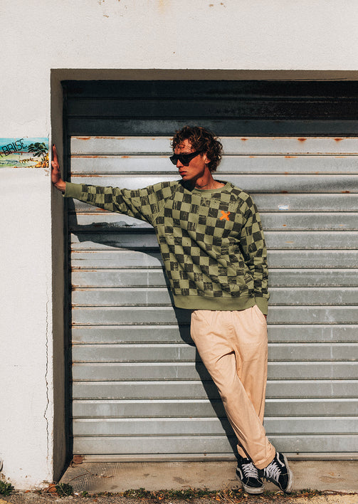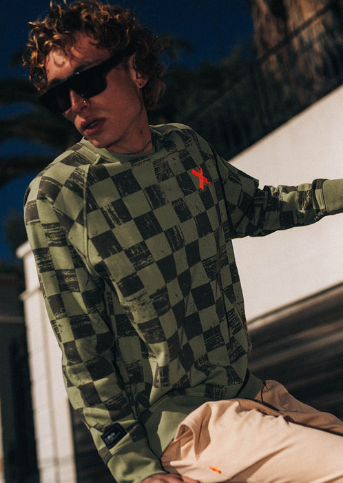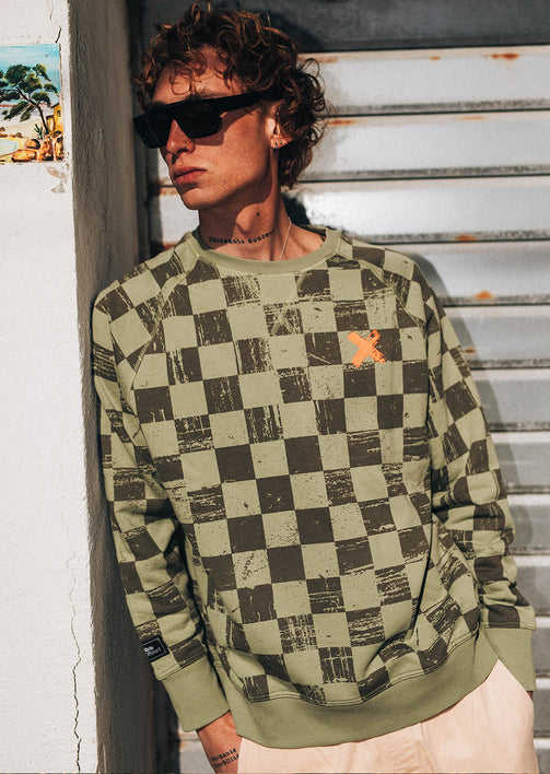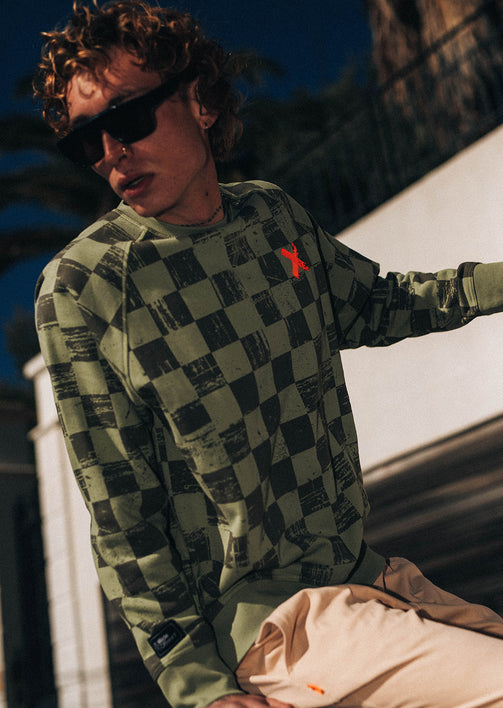 X-CHESS - Starkes Design und zeitloser Schnitt: das X-CHESS OLIVE Sweatshirt etabliert sich als Signature Piece der PHANTOM Limited Edition Sein Ton-in-Ton-Karomuster bedeckt das gesamte Sweatshirt und verleiht dem Olivton Tiefe und Charakter. Ein auffälliges, aber ausgewogenes Muster, das das Kleidungsstück optisch strukturiert, ohne es zu überladen. Sein gerader Regular Fit und die Raglanärmel sorgen für eine klassische Silhouette, die sich leicht im Alltag tragen lässt.
