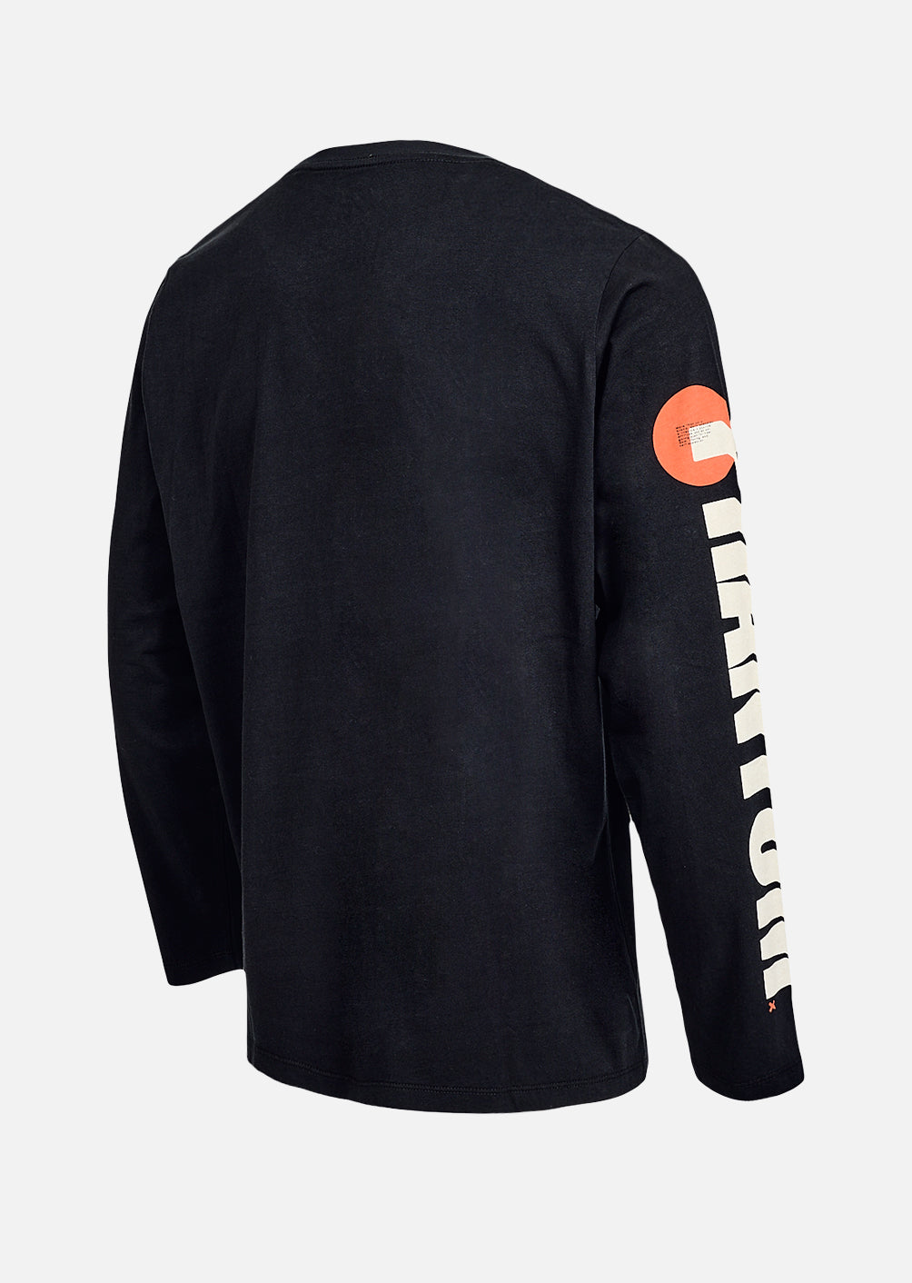 This black long-sleeved model stands out with its contrasting prints: the PHANTOM logo in vertical lettering on both sleeves adds an urban and assertive touch, while a round orange graphic detail subtly signs the heart of the t-shirt. The back remains simple, allowing the full strength of the message to be expressed on the arms.