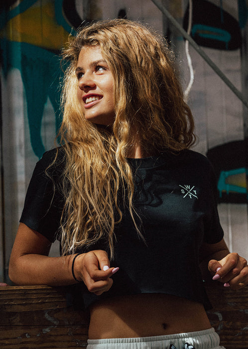 Discover the Malua Black crop top T-shirt , made from organic cotton, your new basic. This short-sleeved model is ideal for pairing with your sports outfits, especially with shorts on sunny days, or for relaxing on the beach during your surf lesson, over your swimsuit. Crafted from organic cotton, it features a relaxed fit at the waist for a modern yet relaxed look. Its subtle brand logo detailing on the left side near the chest adds a touch of pizzazz yet is discreet.