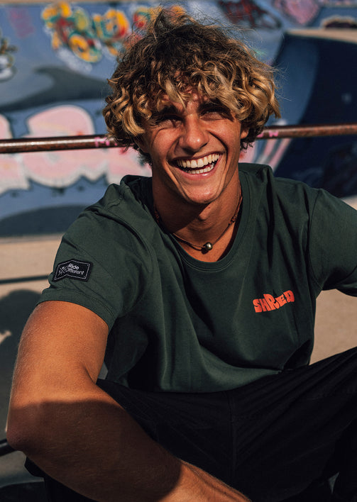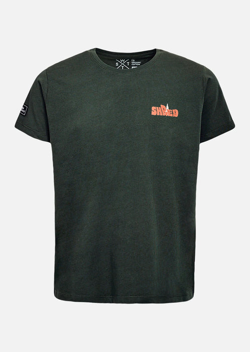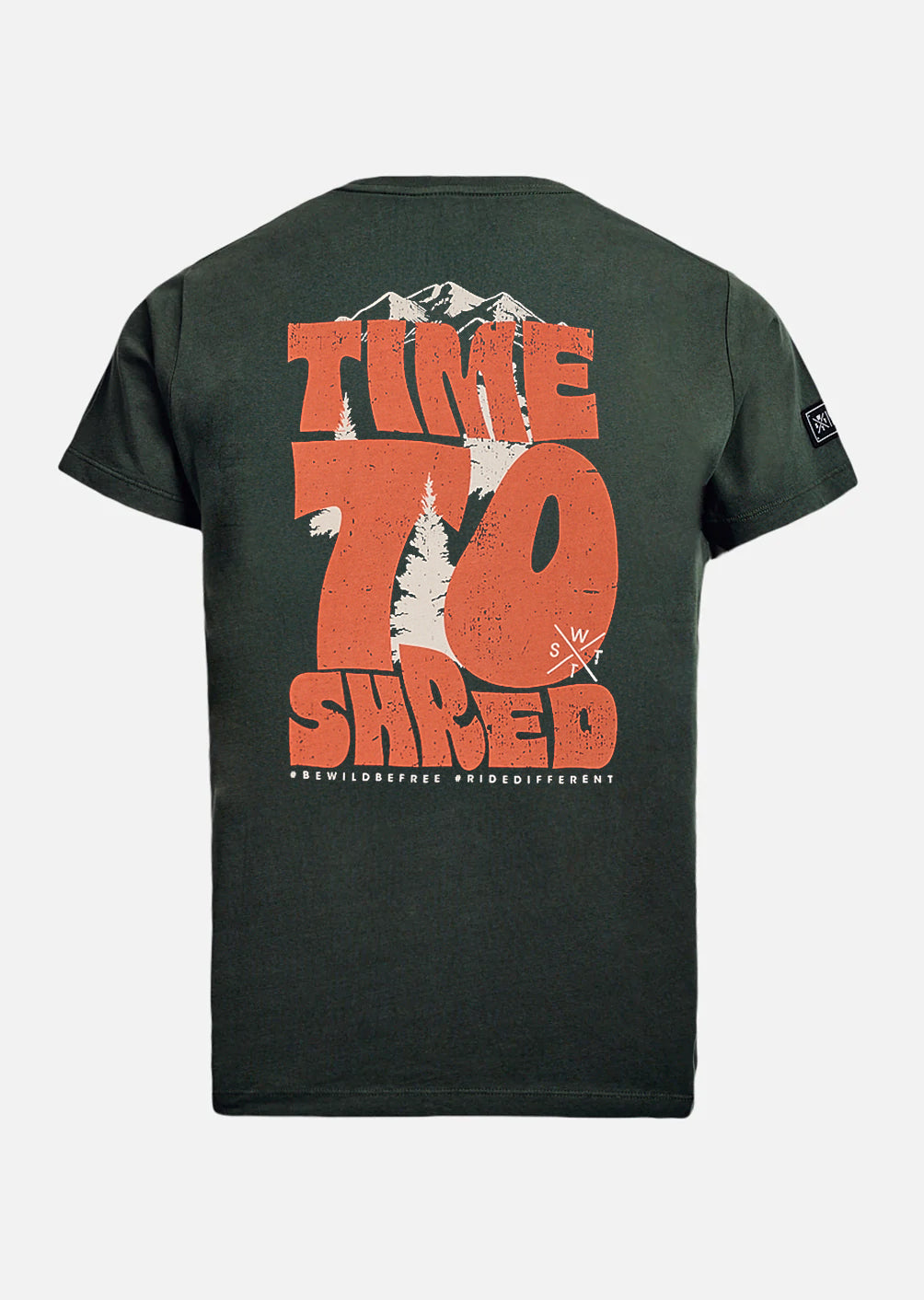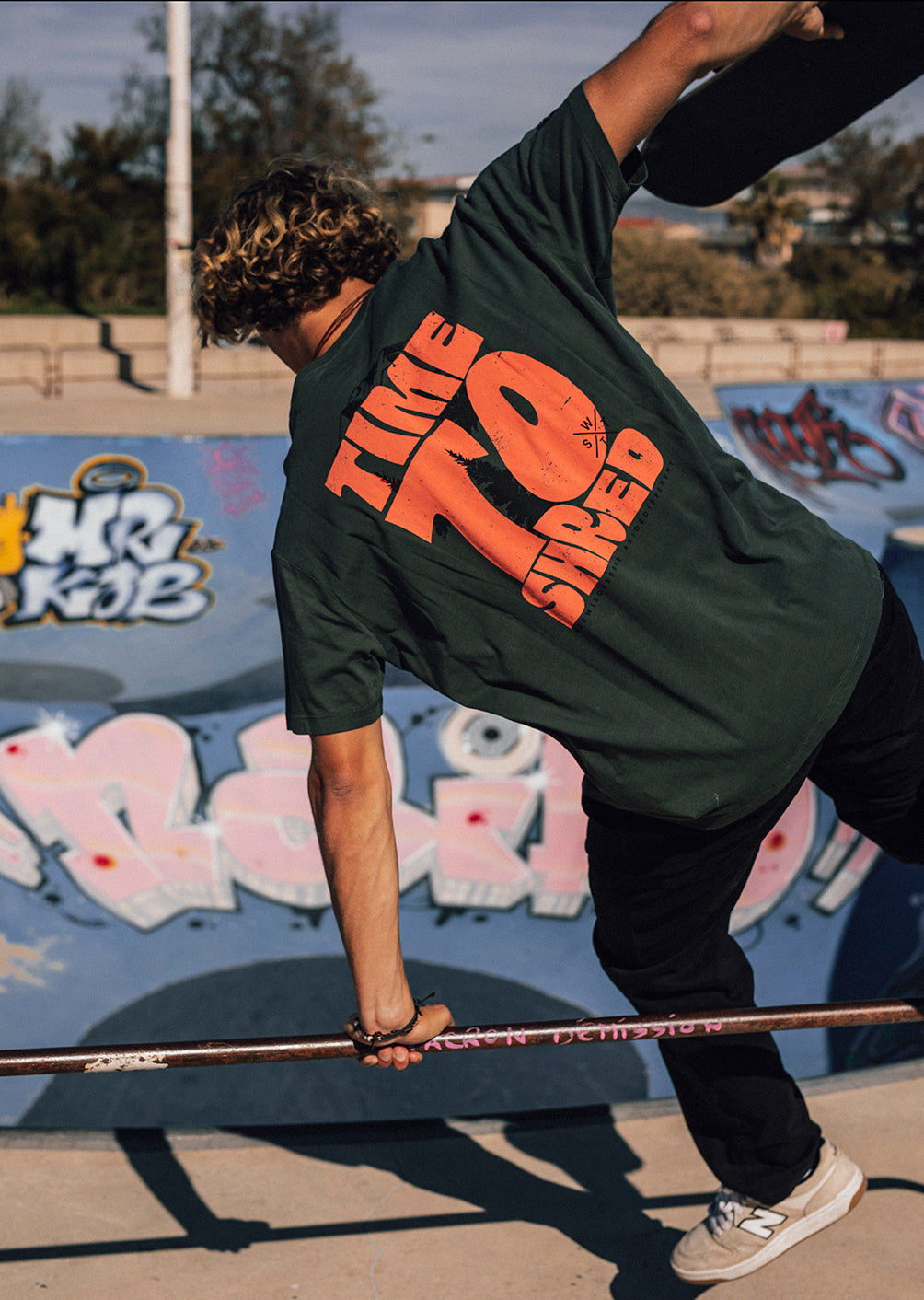 The SHRED Dark Green T-shirt combines a simple base with a visual explosion on the back. The neon orange of the "TIME TO SHRED" print brightens the natural hue of the certified organic cotton.