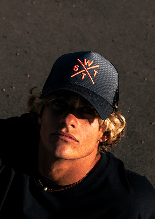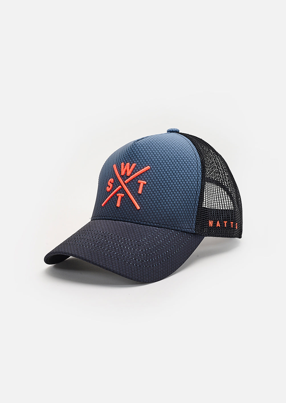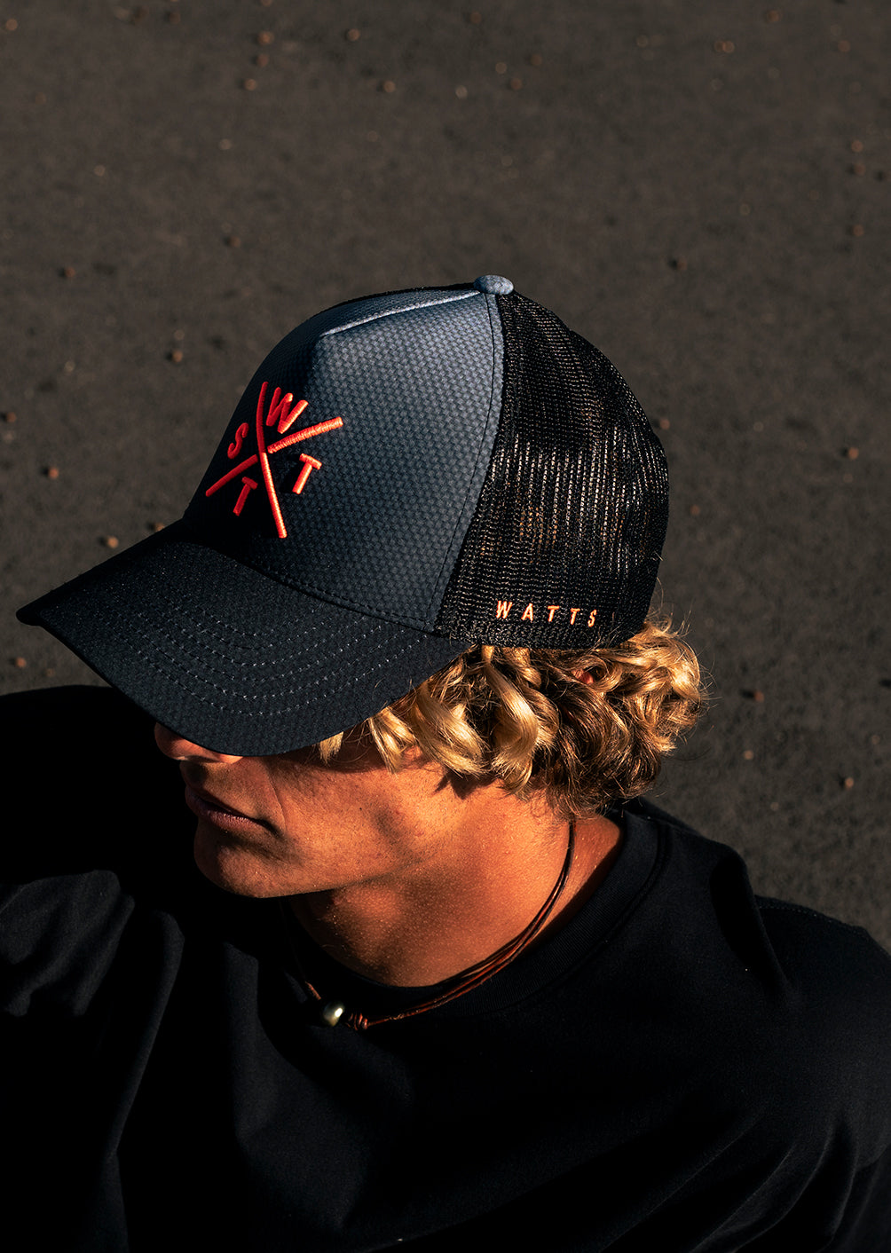 The carbon print and its color gradient on the front evoke technical materials, surfaces that move, that live. The 3D embroidered logo captures just the right amount of light to signify the style without shouting. At the back, the breathable mesh wicks away heat when the intensity rises on the board, or outdoors. The adjustable fit adjusts to the second, for a secure, comfortable fit, even when you're moving fast.