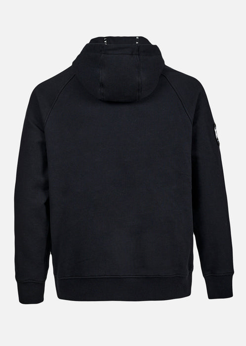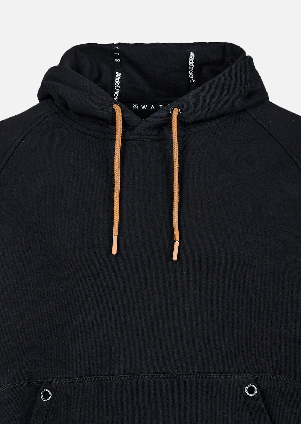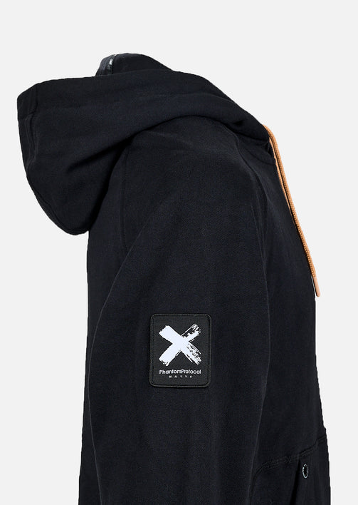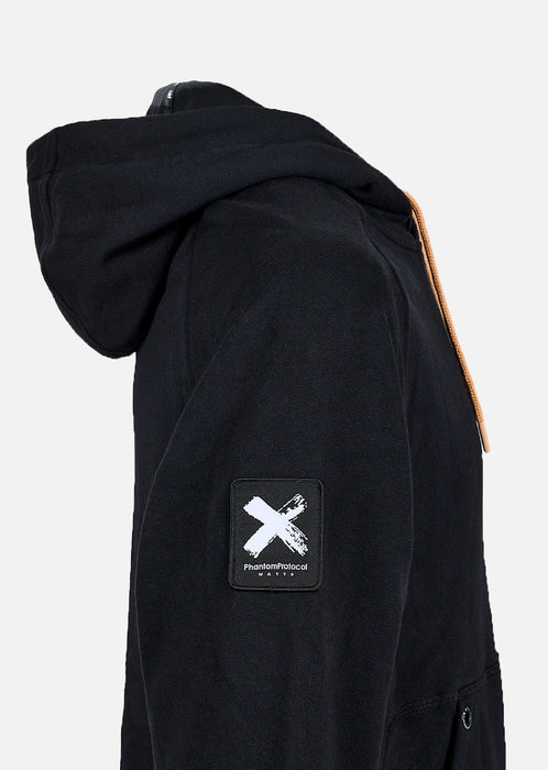 Its deep black hue is accentuated by carefully considered finishes: tone-on-tone drawstring with metal tips, practical kangaroo pocket with stitching details, and discreet Phantom Protocol signature patch sewn on the hip. The washed fabric gives it a slightly worn effect, for a naturally vintage and refined look.