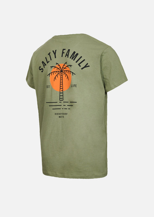 À l’avant, une sérigraphie discrète côté gauche apporte une signature subtile. Au dos, le visuel “SALTY FAMILY” structuré autour d’un palmier central crée un impact graphique fort, entre univers surf et lifestyle.