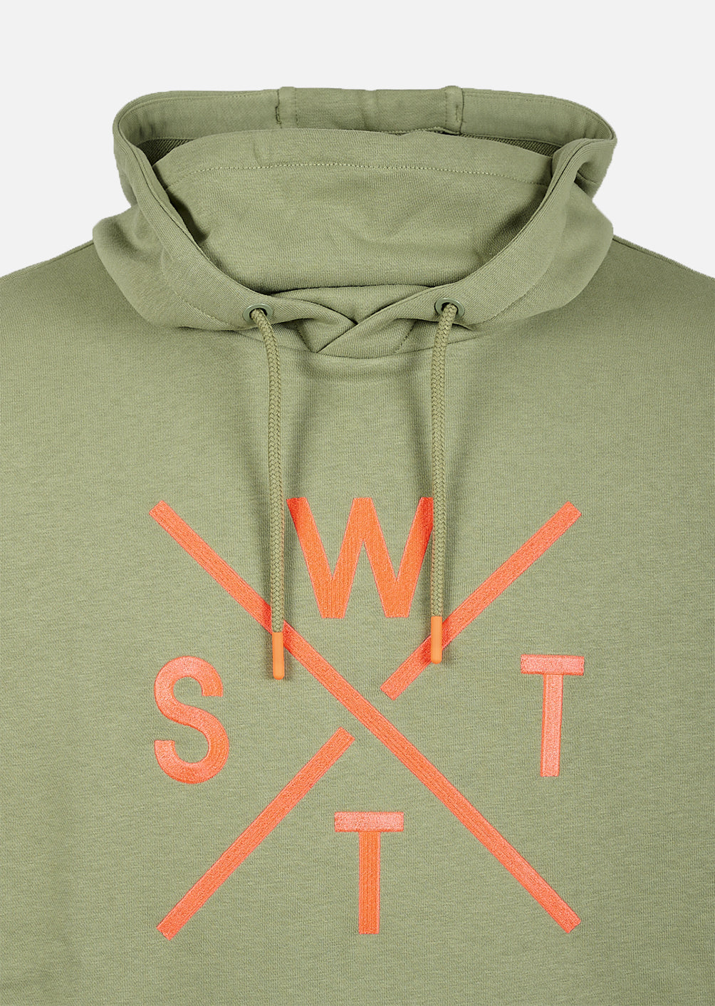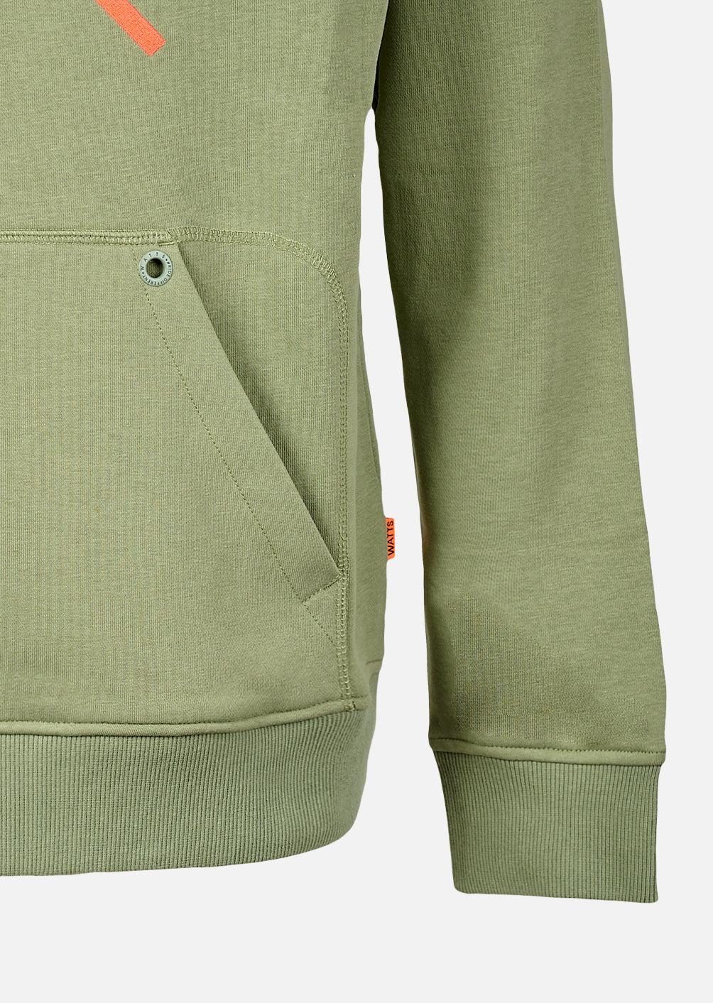 With its slim fit, adjustable lined hood, stand-up collar, and integrated thumb loops, this hoodie combines urban style with functionality. The bright orange WATTS logo on the chest adds a touch of character while remaining true to the streetwear universe.