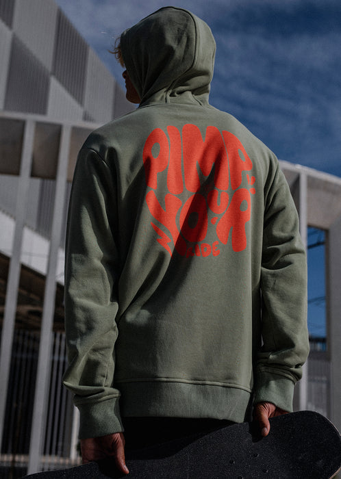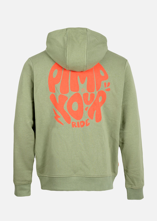 Fabriqué en coton biologique et polyester recyclé, il combine douceur et tenue, pour un port agréable au fil de la journée. Dans le dos, l’imposant motif "PIMP YOUR RIDE" orange affirme son caractère et injecte une dose d'énergie à l’ensemble. Ce contraste se prolonge dans la capuche, doublée de tissu orange fluo, qui offre une protection efficace tout en ajoutant une touche visuelle inattendue.