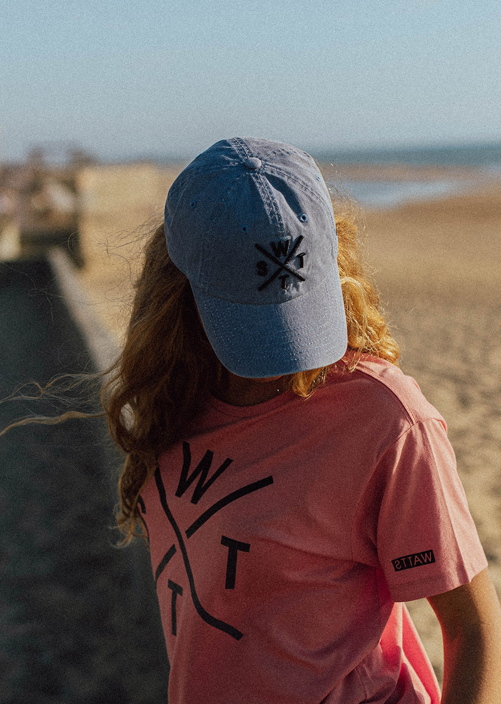 - Sur le devant : Tissu uni en Coton CANVAS avec une teinture effet usé, broderie WATTS 3D + visière