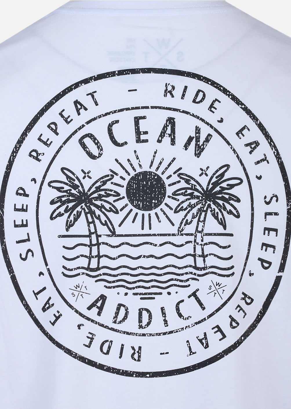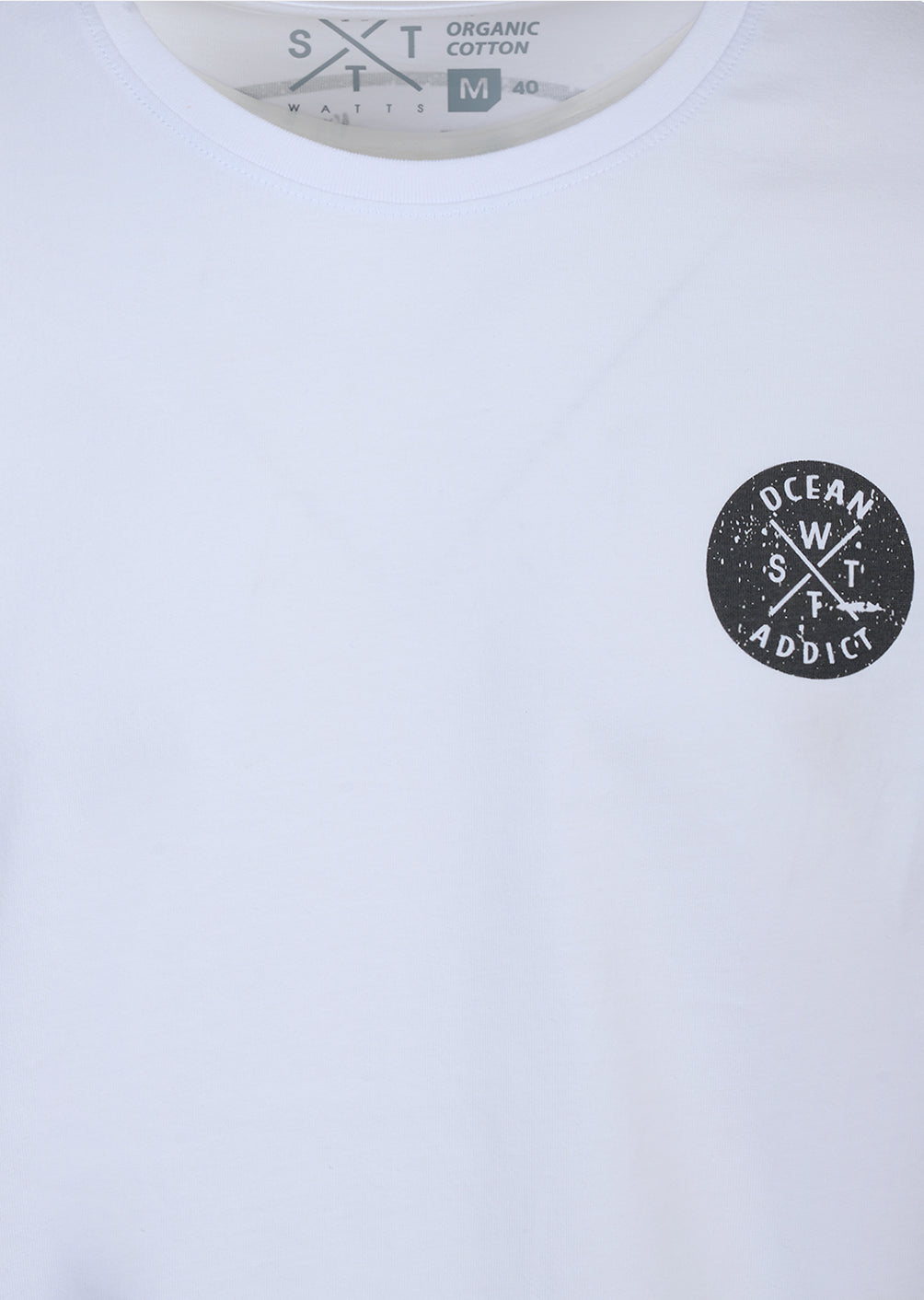 Le logo discret placé sur la poitrine contraste avec le grand visuel circulaire au dos, créant une identité forte et contemporaine. L’étiquette drapeau WATTS, insérée dans la couture côté droit, vient signer la pièce avec sobriété.