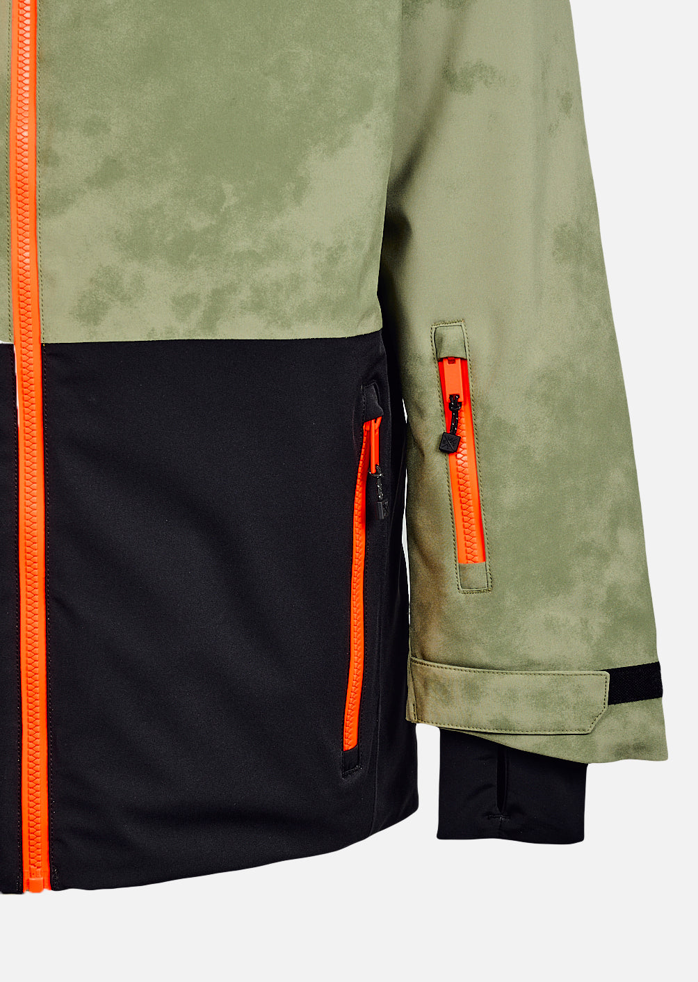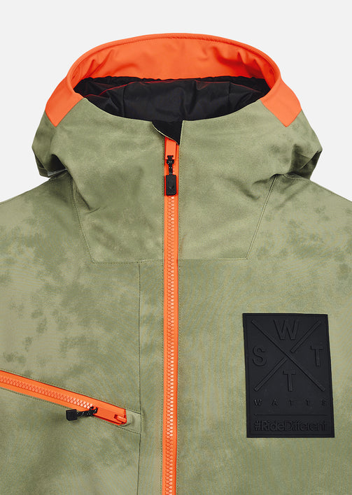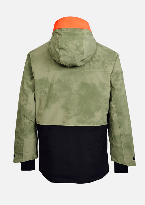 Son imprimé Tie & Dye Olive, minéral et naturel, donne une dimension texturée et profonde à cette veste taillée pour les sessions engagées en rando, en hors-piste ou en sessions tricks.